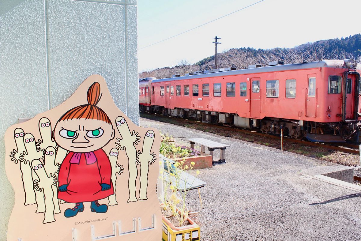 途中の駅はどこもローカルな雰囲気で、車窓からはいすみ市の豊かな田園風景が楽しめるのも魅力の一つ。そののどかな景色が「ムーミン谷」に似ていることなどから、いすみ鉄道は別名「ムーミン列車」とも呼ばれているんです。黄色い列車にはムーミンのイラストも!
