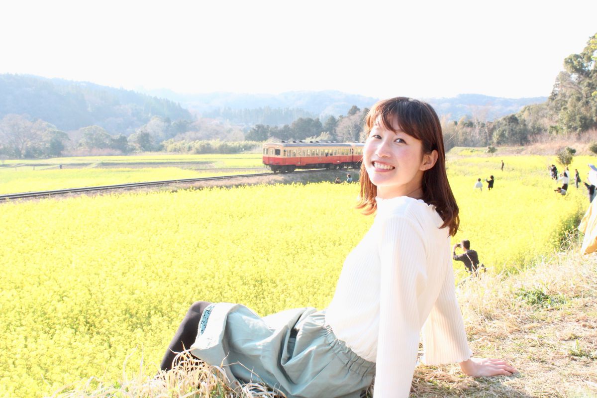 東京駅から特急わかしおに乗って1時間ほどの、大原駅で下車。ここ、いすみ市と言えば、春に咲く菜の花が有名なんです。特に、地元のローカル列車であるいすみ鉄道の線路沿いに咲く一面の菜の花畑は必見!