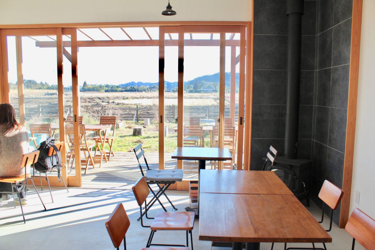 店内はテラス席へと続く大きな窓からたっぷりの陽の光が差し込み、明るくシンプルな雰囲気。奥さんの亜希子さんが設計を手がけたというカフェは、なるべくリユースできる材料を使って建てられていて、環境にやさしい設計・デザインになっているのだそう。