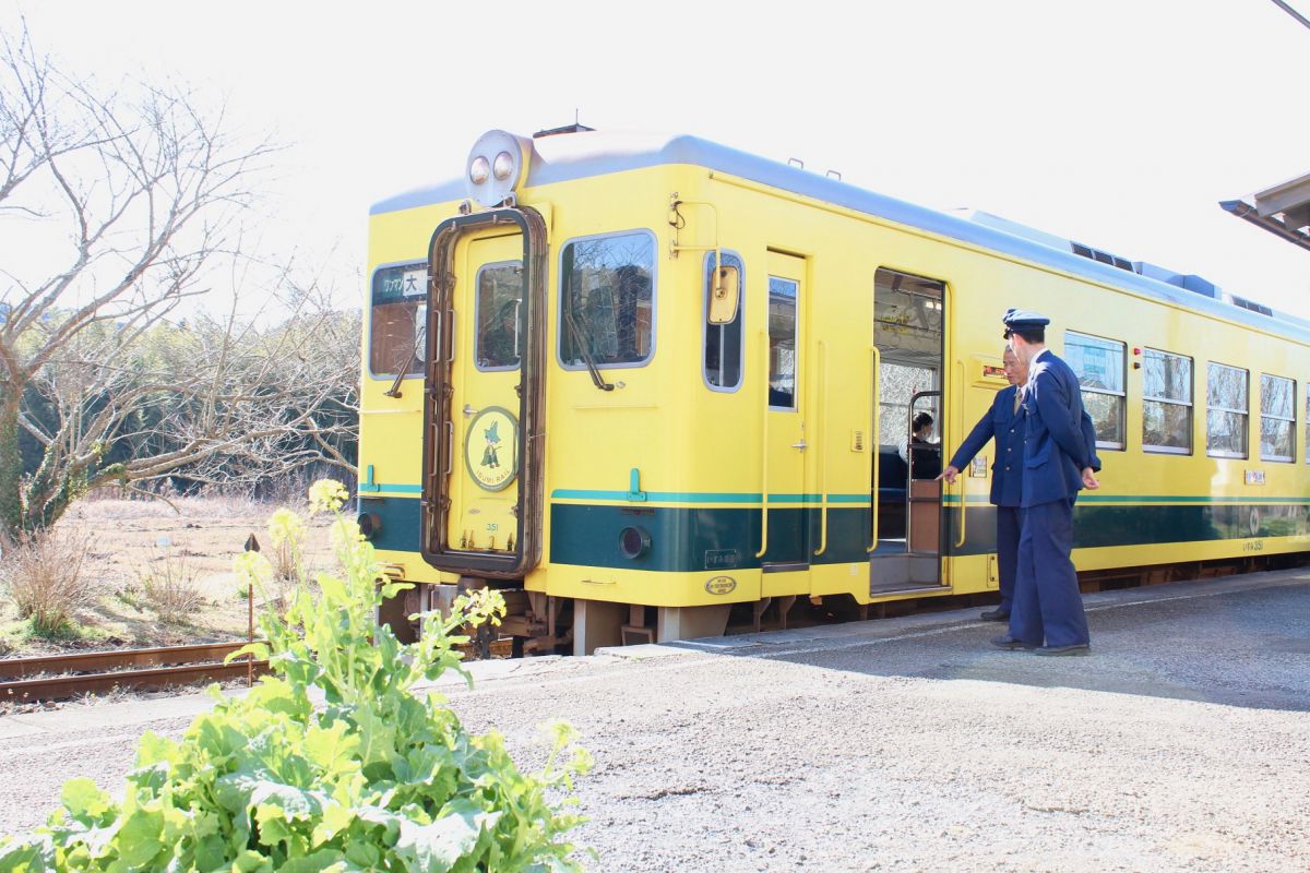菜の花カラーがかわいいレトロないすみ鉄道に乗って移動すれば、春のおさんぽ気分が高まりますよ。いすみ鉄道には、東京駅からの特急わかしおが到着する大原駅から乗車することができます。