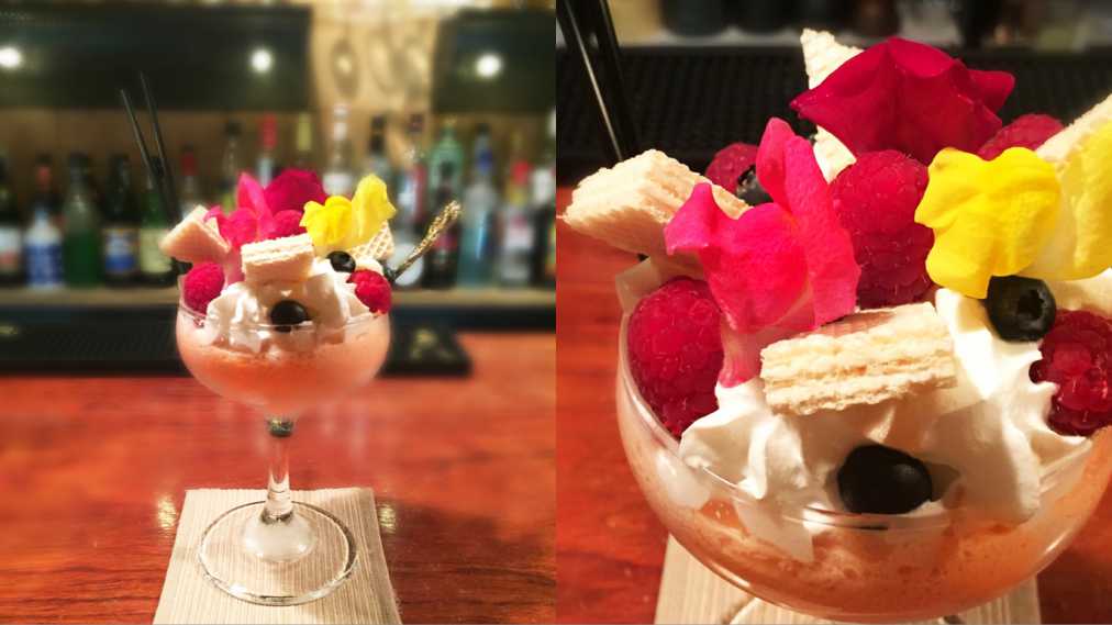 最後にオーダーしたのが、女子なら1度は憧れる「アメリ」(1188円)。出てきたのはフローズンカクテルにホイップやフランボワーズ、ウエハースや花が盛られたとってもキュートな1杯!かわいらしくいたずら好きのアメリをイメージしたのだとか。