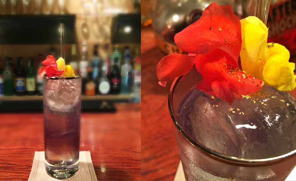 パープルのグラデーションがかったカクテルの上には、可憐な花が2つ。主人公の2人の恋愛が始まる天文台で踊るシーンをイメージしたカクテルだそう。