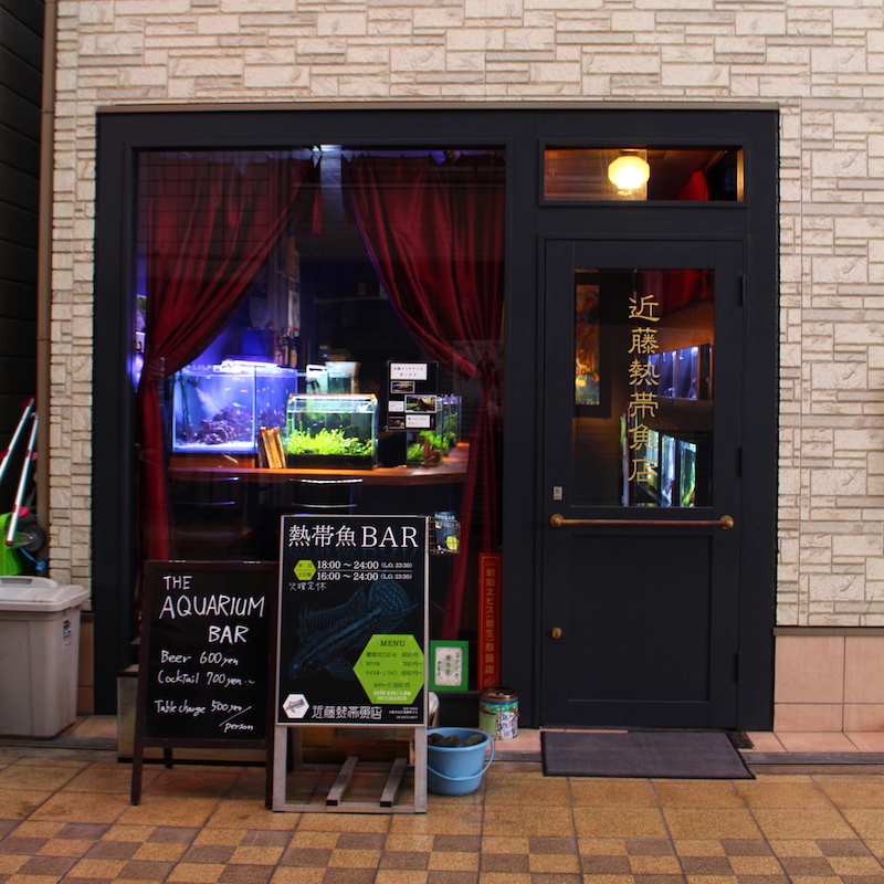 大阪・中崎町の商店街「天五中崎商店街(おいでやす通り)」の中でも、ひと際レトロシックな雰囲気で異彩を放つ「近藤熱帯魚店」。窓から漏れる水槽の光があやしげで大人な雰囲気です。