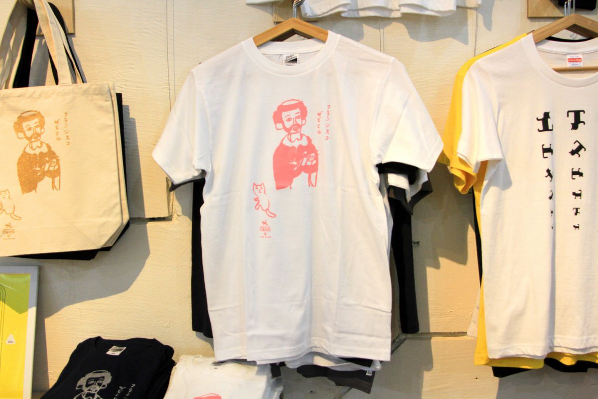 オープン当初からのヒット商品が、ザビエルと尾曲り猫のTシャツ各3500円。江戸時代に長崎県にキリスト教を伝えたザビエルが描かれたTシャツはおみやげに買って行く観光客も多いとか。