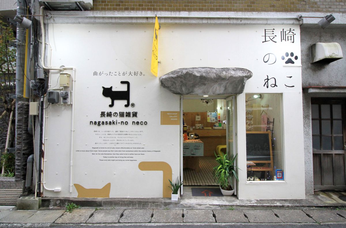 長崎市のやすらぎスポット、中島川通りと電車通りの間の路地裏に、ひっそりと佇むお店。外壁にはお店のキャラクター猫の尾曲り猫のイラストに、「曲がったことが大好き」と思わずにんまりしてしまうコピーが。お店の中に入るのが楽しみになります。