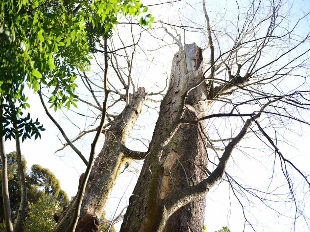絵馬トンネルをくぐると、本殿の裏手へ。裏手には樹齢600年を超えるといわれる2本の御神木のケヤキが立っています。ケヤキの足元には石の道が造られていて、木の間で交わるように8の字に歩けば良縁・幸せに恵まれるといわれているそう。