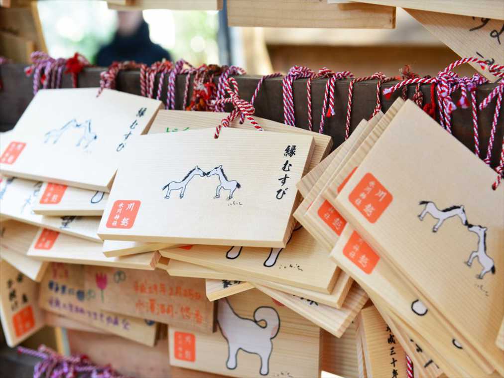 本殿のすぐ脇にある“絵馬トンネル”には、「縁結びの絵馬」がずらり!絵馬に描かれている、仲よしの馬が幸せそうに顔を寄せ合う様子はなんとも微笑ましい。この絵馬は、通常サイズとミニサイズのセットで頒布されています。通常サイズは願いごとを書いて絵馬トンネルに奉納、ミニサイズは持ち帰って大切に持っておきます。