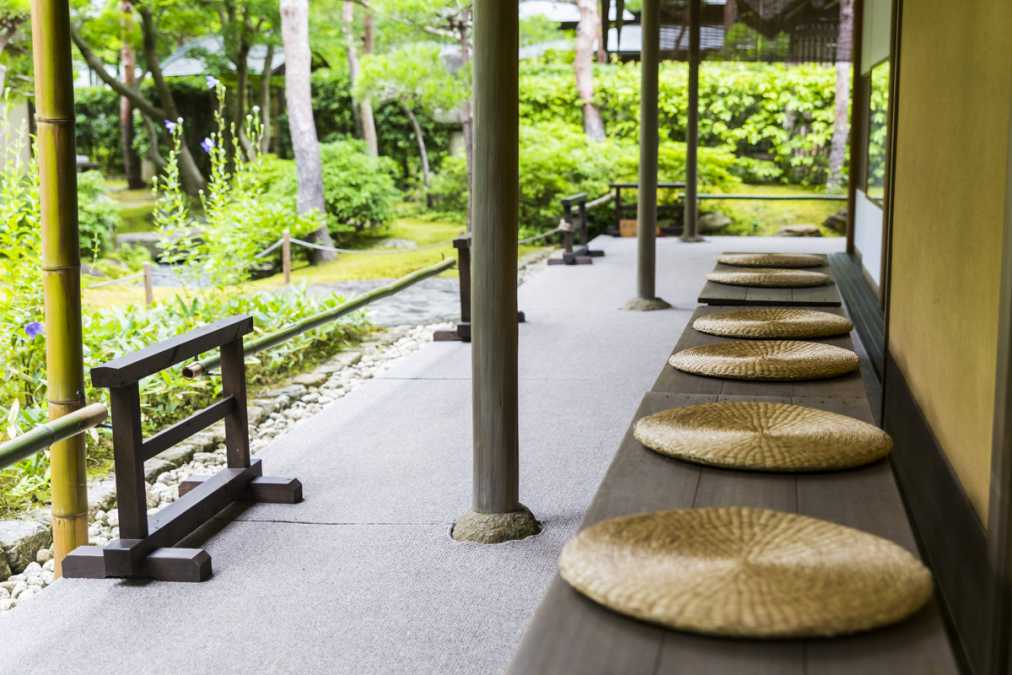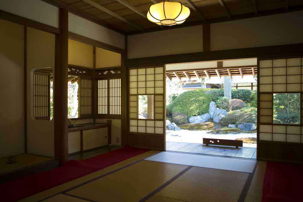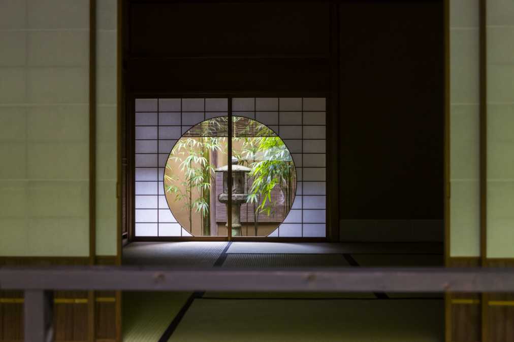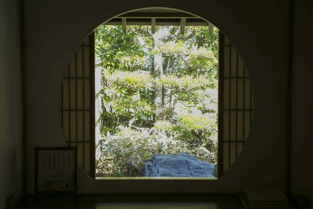 また、「一条恵観山荘」の茶席「時雨」では、歴史ある道具を使った茶の湯体験を不定期で開催(日程は公式サイトで確認)。障子が開けられている時のみ見られる円窓は風情たっぷりで、カメラを構えたくなるフォトジェニックなスポット。障子にぽっかりとあいた円窓の奥からやさしい陽が差し込み、和室の畳の上にも満月のような光の円が描かれる様子も素敵です。