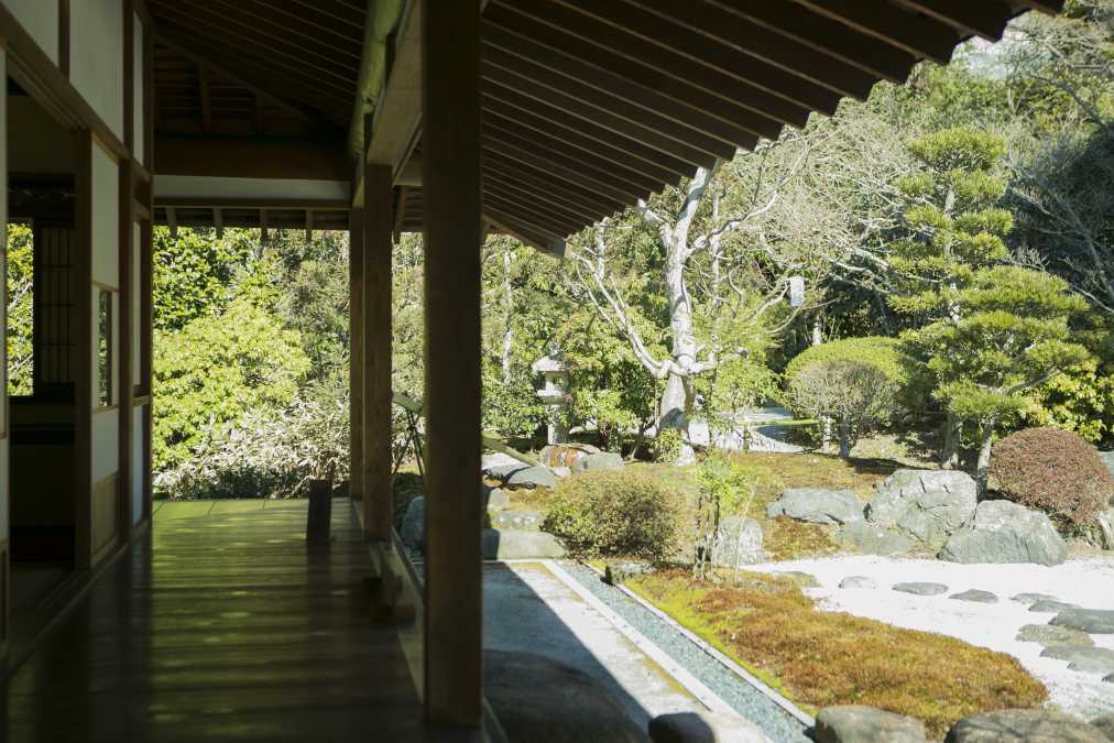 鎌倉駅からバスに揺られて約10分。金沢街道沿いにある竹の大きな門が見えたら「一条恵観山荘」に到着です。この山荘は、後陽成天皇の第九皇子であった一条恵観が1646(正保3)年に京都・西賀茂に築いた山荘を、昭和期に鎌倉の地に移築したもの。建物だけでなく、枯山水や飛石を含めた庭園も一緒に移したというから驚きです。