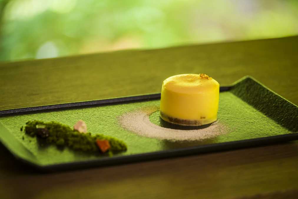 「醍醐のケーキ」(650円)は、ふんわりやさしい口当たりのチーズケーキと抹茶の相性が抜群のひと品。その昔、チーズのことを醍醐と呼び、それは王族貴族しか口にできない大変高価なものだったそうです。苔に見立てた抹茶のクラム、石に見立てたチョコレートをお皿に配して庭園を再現しています。