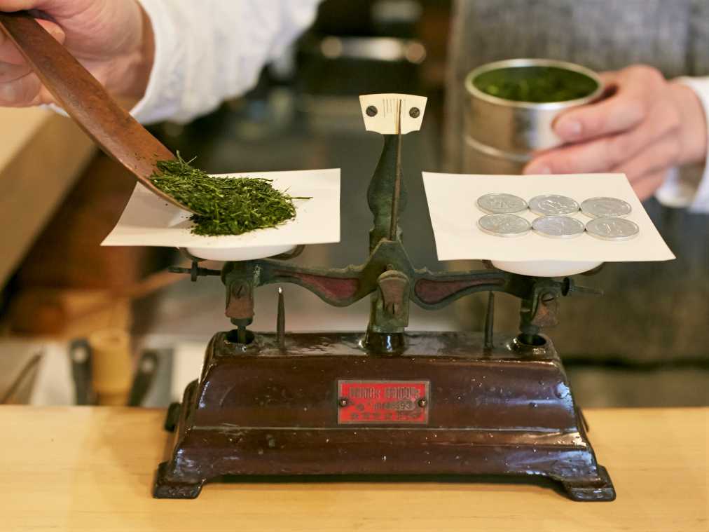 はかりの上に一円玉が6枚…。目の前で繰り広げられる不思議な光景に、これから何が行われるのかと目は釘付けに。実はこれ、急須に入れる茶葉の量を計測しているところなんです。1枚1gの一円玉が6枚で「6g分の茶葉」というわけ。