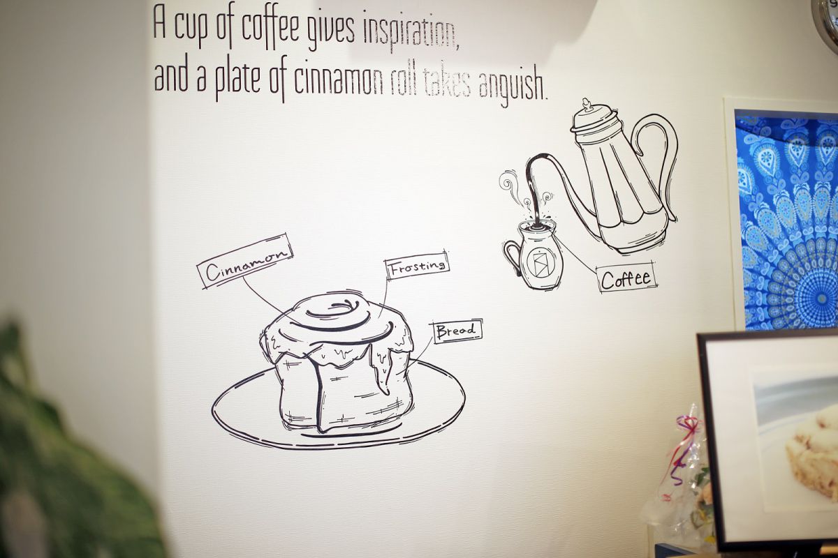 お店の中を見回してみると、あちらこちらに素敵な絵が飾られています。なんとこの絵はすべて、シナモンロールを作っているtommyさんが描かれたものだそう!あまりのクオリティの高さに驚き!ついたくさん写真を撮りたくなってしまいます。
