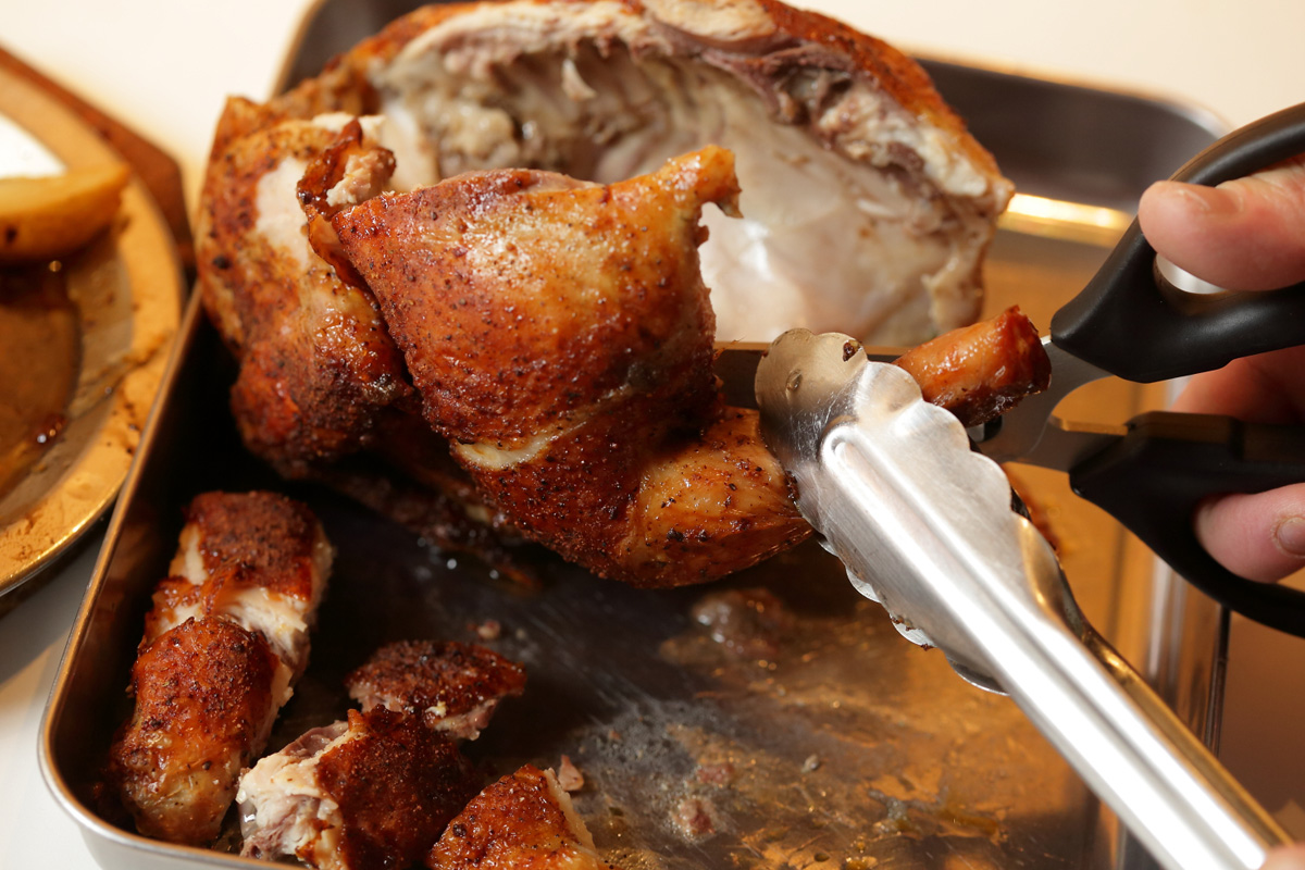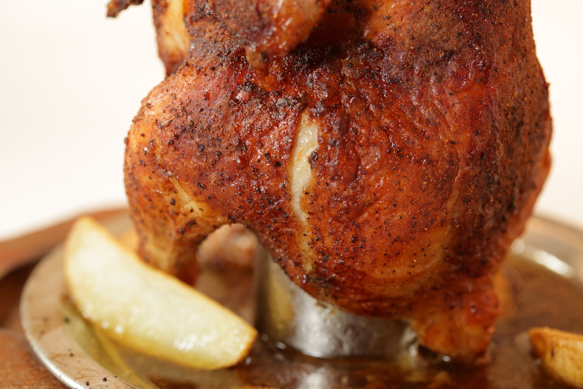 中を抜いた丸鶏1羽分を使用します。ハーブマリネ液に漬け込んだ後、10種類以上のスパイスをたっぷりとふりかけます。