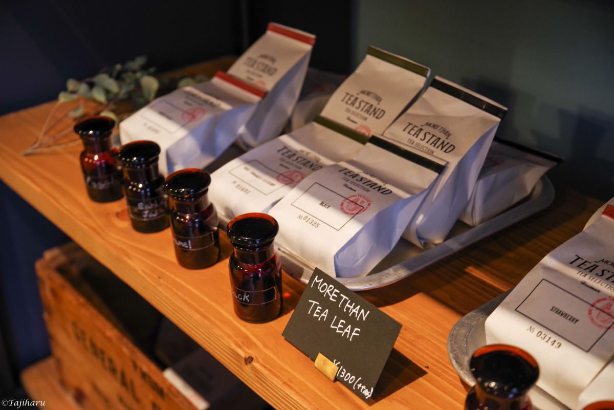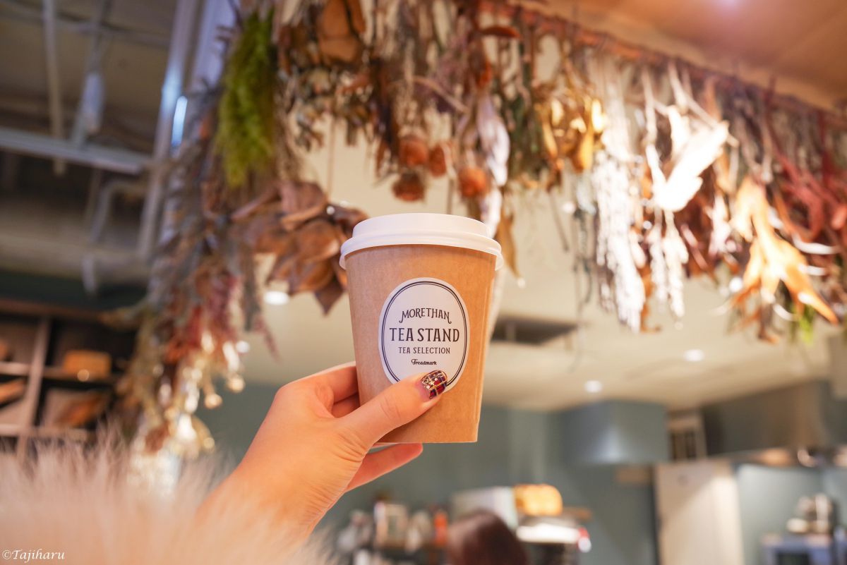 ドライフラワーが吊るされているカウンターは「MORETHAN TEA STAND(モアザン ティー スタンド)」。ベーカリーと隣り合うティースタンドでは美味しい紅茶をいただけます。ストレートティー、ミルクティー、チャイなどがあり、トッピングにタピオカや生クリームの追加もOK。