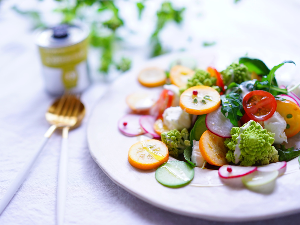 モッツァレラチーズやラディッシュ、ロマネスコなどを使い、ちょっとおしゃれなサラダを作ってみました。お好みのドレッシングや、オリーブオイルをかけて召し上がれ。