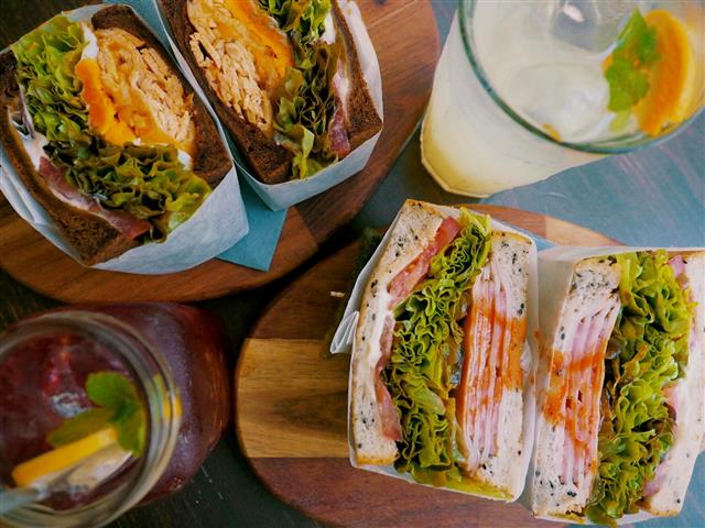 ライ麦やゴマのパンに挟むのは、ターキーやパストラミ、ローストチキン、アボカド、たっぷりの野菜など。ボリュームがありながら、ヘルシーなサンドイッチはランチにぴったりです。サンドイッチはすべてトーストされているので、温かくさっくりとした歯ごたえが堪能できます。