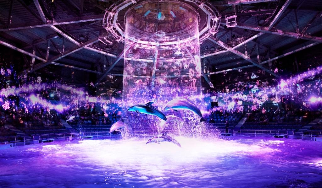 一番のお楽しみは、夜のドルフィンパフォーマンス「桜語り」。中央のウォーターカーテンと会場を舞うデジタルアートの桜、そこにイルカたちのパフォーマンスとデジタルサウンドが1つになった、大迫力の360度お花見体験が1日2回(19時・20時30分)楽しめます。