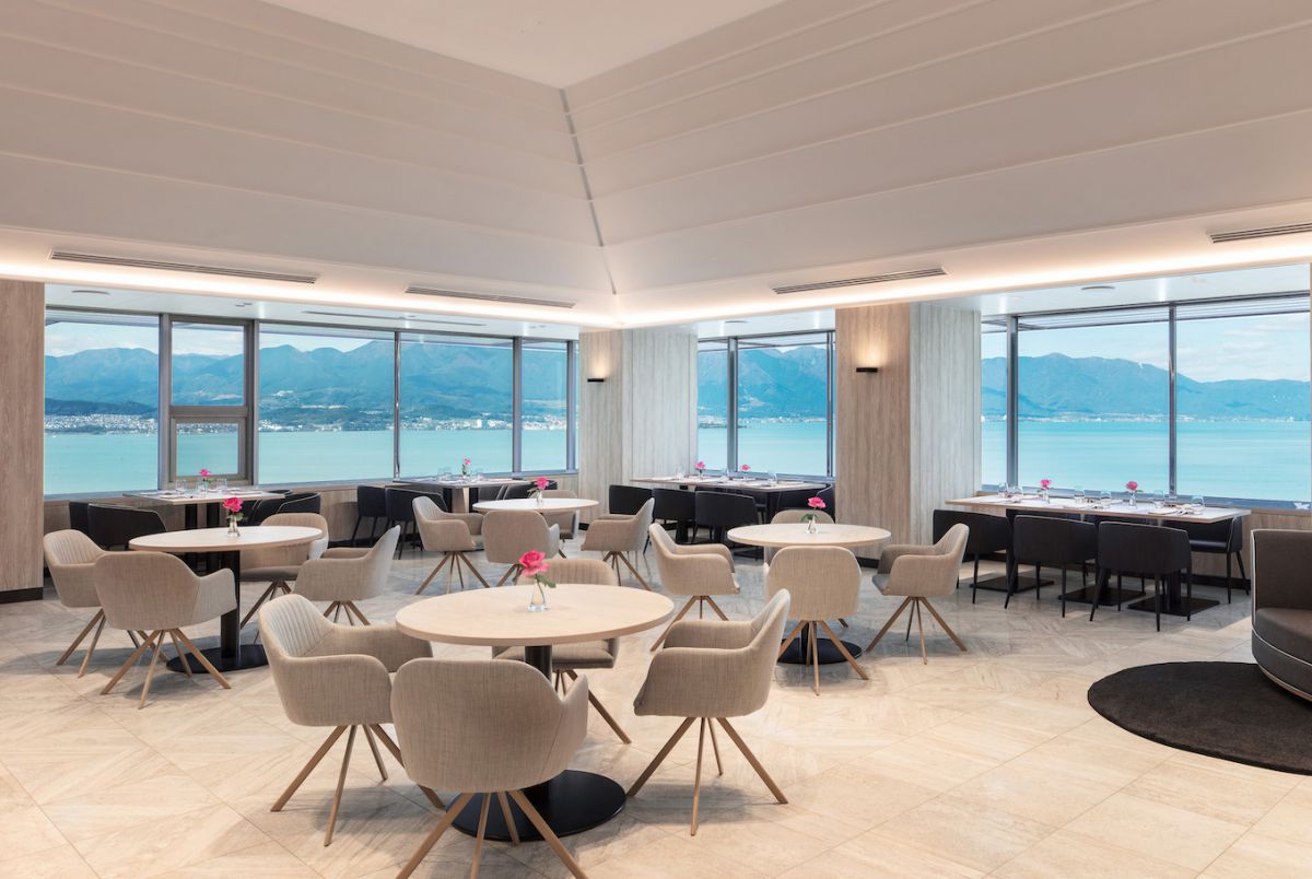 琵琶湖マリオットホテルがあるのは、湖岸道路沿い。最上階のレストラン「Grill & Dining G」からは穏やかな琵琶湖の景色を一望できます。「SAKURA Lunch Box」をいただけるのは、この絶景ロケーションの中。