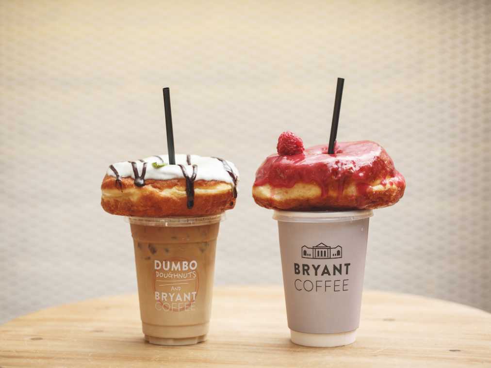 「DUMBO Doughnuts and Coffee」の代名詞でもある、コーヒーオンドーナッツは「BRYANT COFFEE」でももちろん可能。左の「チョコミント」(410円)はしっとりミントソースが特徴。スーッとした口当たりでパクパク食べられます。「フランボワーズのドーナツ」(370円)も人気商品で、フランボワーズの酸味がコーヒーにもぴったりです。(土・日曜のみの限定販売です)
