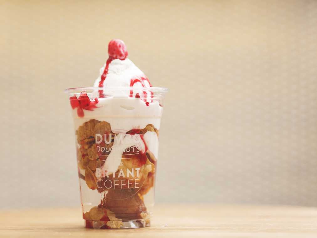 同じドーナッツでも、オリジナルメニューの「ドーナツパフェ」(620円)も注目です。これはアイスクリームの下に丸めたドーナッツが隠れているという新しいスイーツ。冷たいアイスにひと口サイズの食べやすいドーナッツの相性がぴったりです。ショーケースにある分しか販売していないので、確実に購入したければ午前中がオススメ!