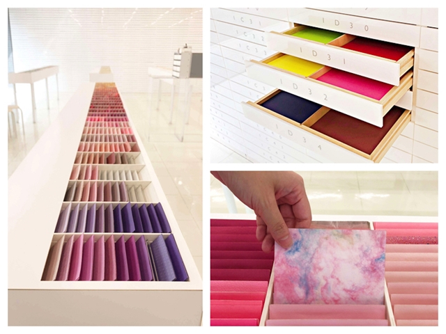 手ざわり、模様、質感の違う紙がそろう紙専門店のショールーム