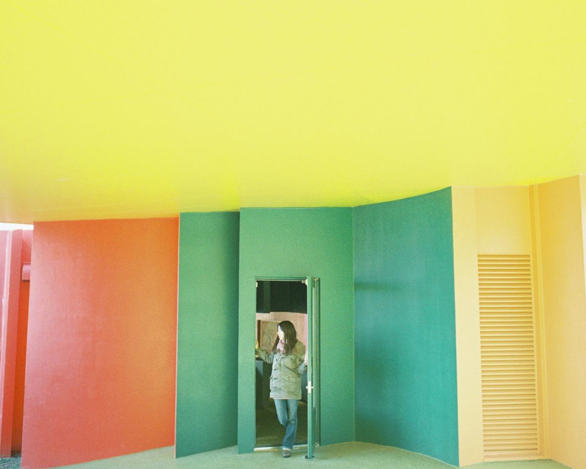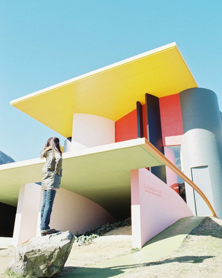 こちらからの角度もカラフルで面白いですよね。よく見るとピンクの壁に「養老天命反転地オフィス」って書かれています。これがオフィス?って、なりますね。