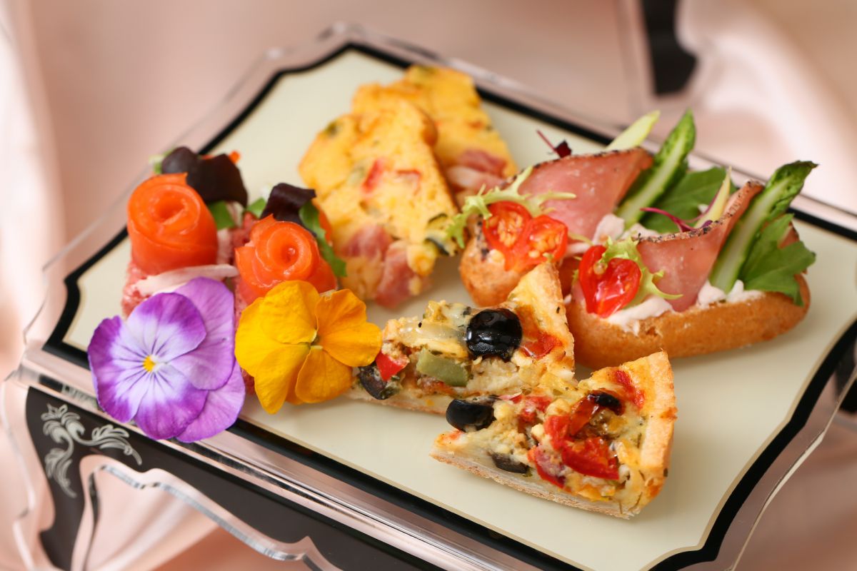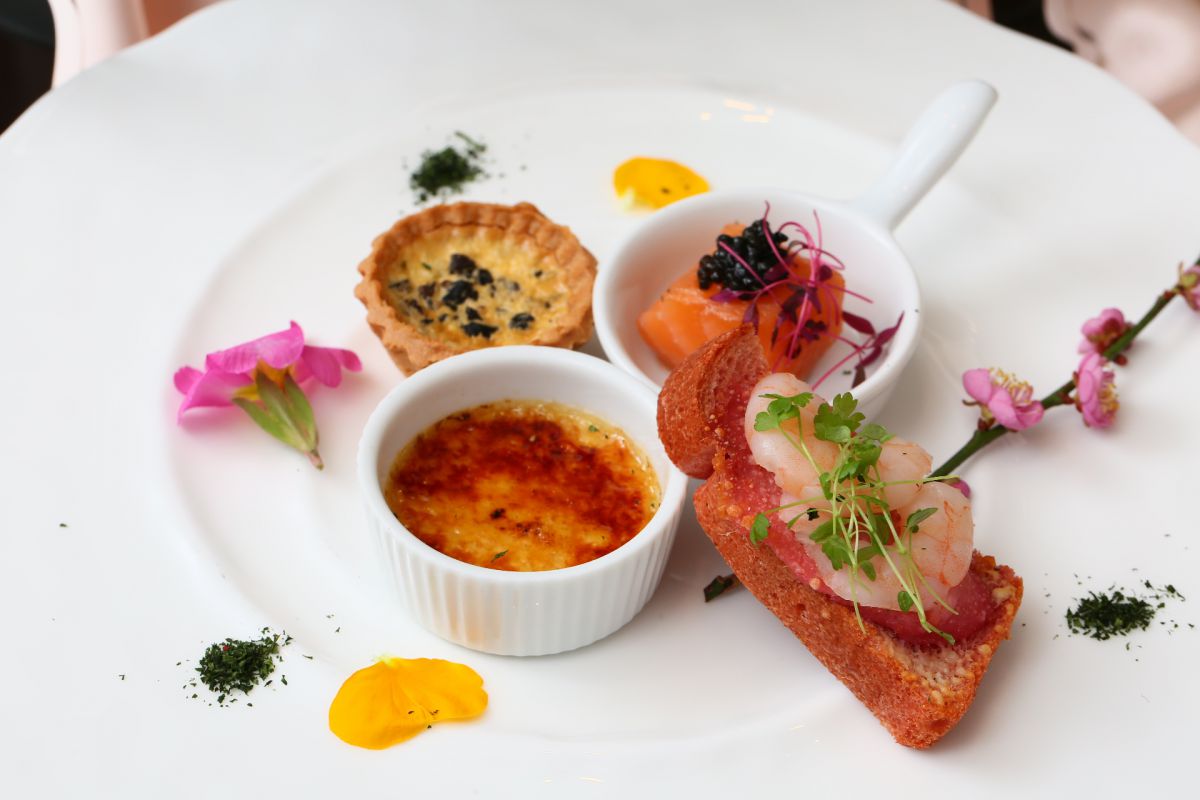 セイボリーには、フォアグラのブリュレ桜の香りや、キューブサーモンキャビア添え、トリュフのキッシュ、ビーツと海老のスモーブローと世界三大珍味のオードブルが並びます。