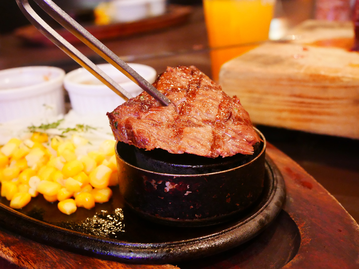 お肉はペレットで好きな焼き加減に調整可能。ステーキソースとガーリックソースの2種類のソースがついているので、好みの味で楽しめます。付け合わせのオニオンとコーンの甘みやガーリックのパンチ力ある味わいも、ワイルドなお肉にぴったり合います。