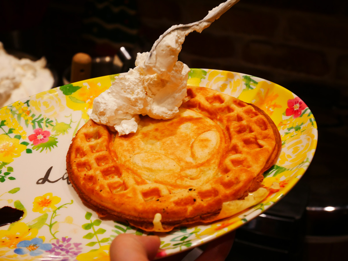 豪華なステーキを味わった後は、別腹のデザートです。自分で焼いて作るワッフルは、モチモチふわふわの食感で何枚でも食べられそう!可愛いエイリアン模様のワッフルメーカーは特注で、生クリームやメイプルシロップ、ジャムもかけ放題です。
