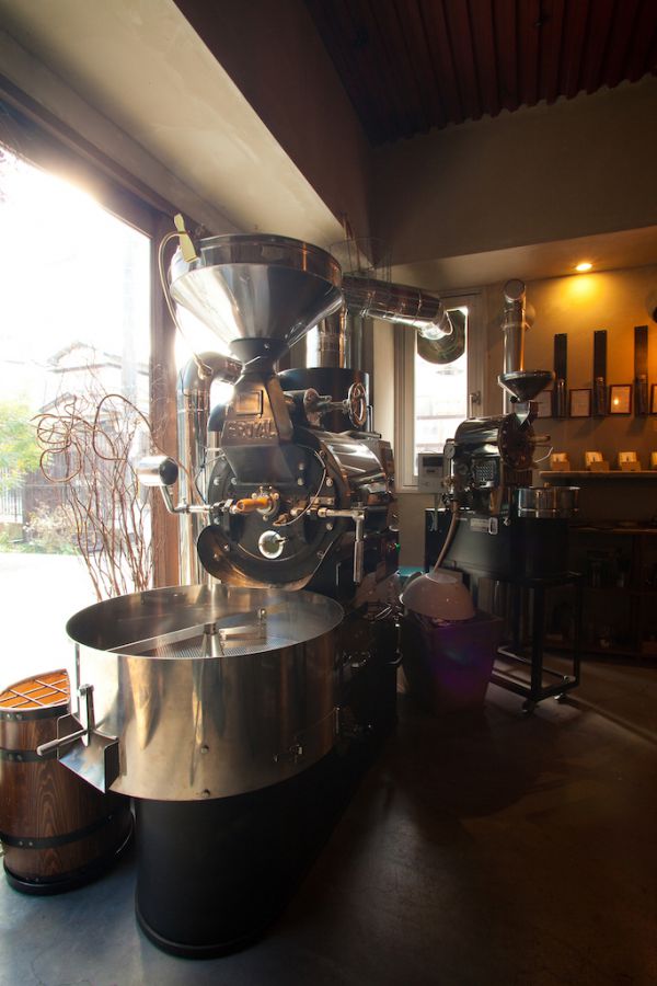 窓際にある、存在感を放つ2台の焙煎機は、豆5kg用と1kg用。用途に合わせてここで生豆を焙煎しています。