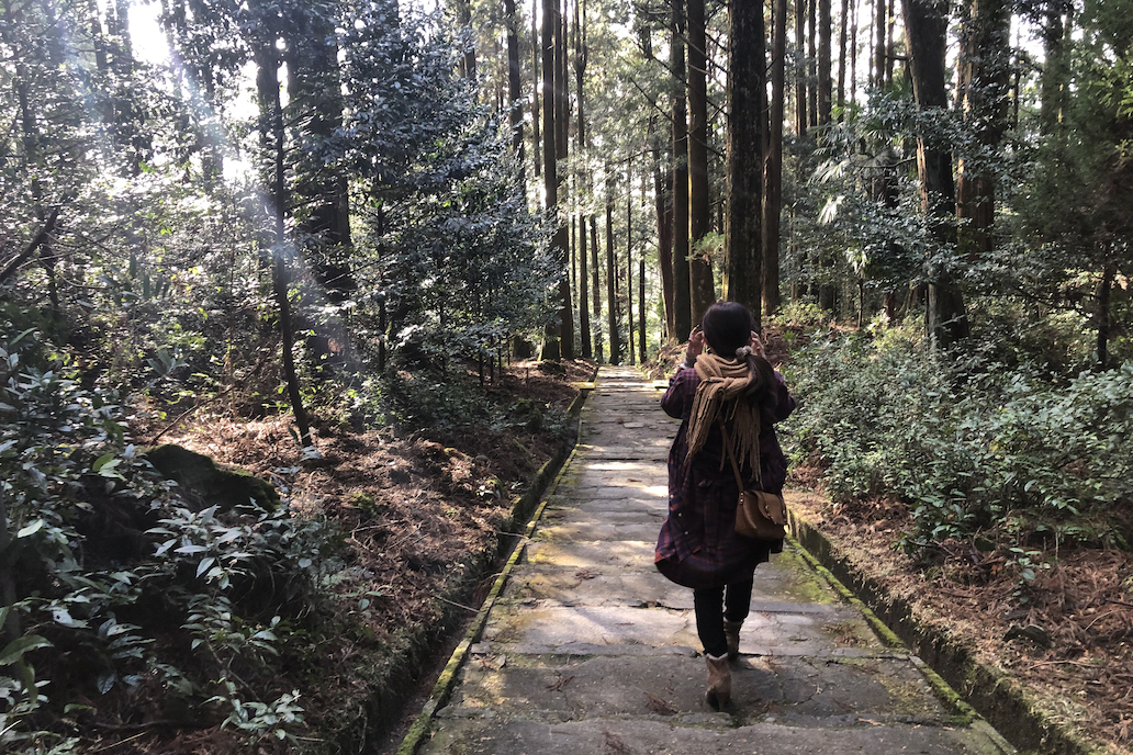 写真は旧参道の亀石坂。西郷隆盛や、新婚旅行中の坂本龍馬・お龍が通った道です。参拝者が絶えず賑わいをみせる現在の参道とはまた違った、巨木に囲まれた厳かな雰囲気を味わうことができます。