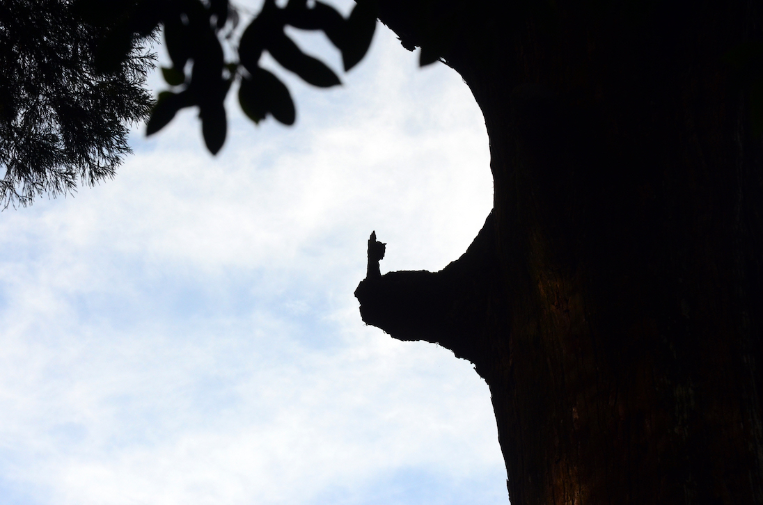 社殿前庭には立派な御神木があり、高さ約35mの巨大な杉(霧島メアサ)は樹齢約800年。南九州の杉の祖とも言われています。生命力にあふれたこの御神木、高さ8mほどのところに「烏帽子を冠り、手を合わせた神様の姿」をみることができます。