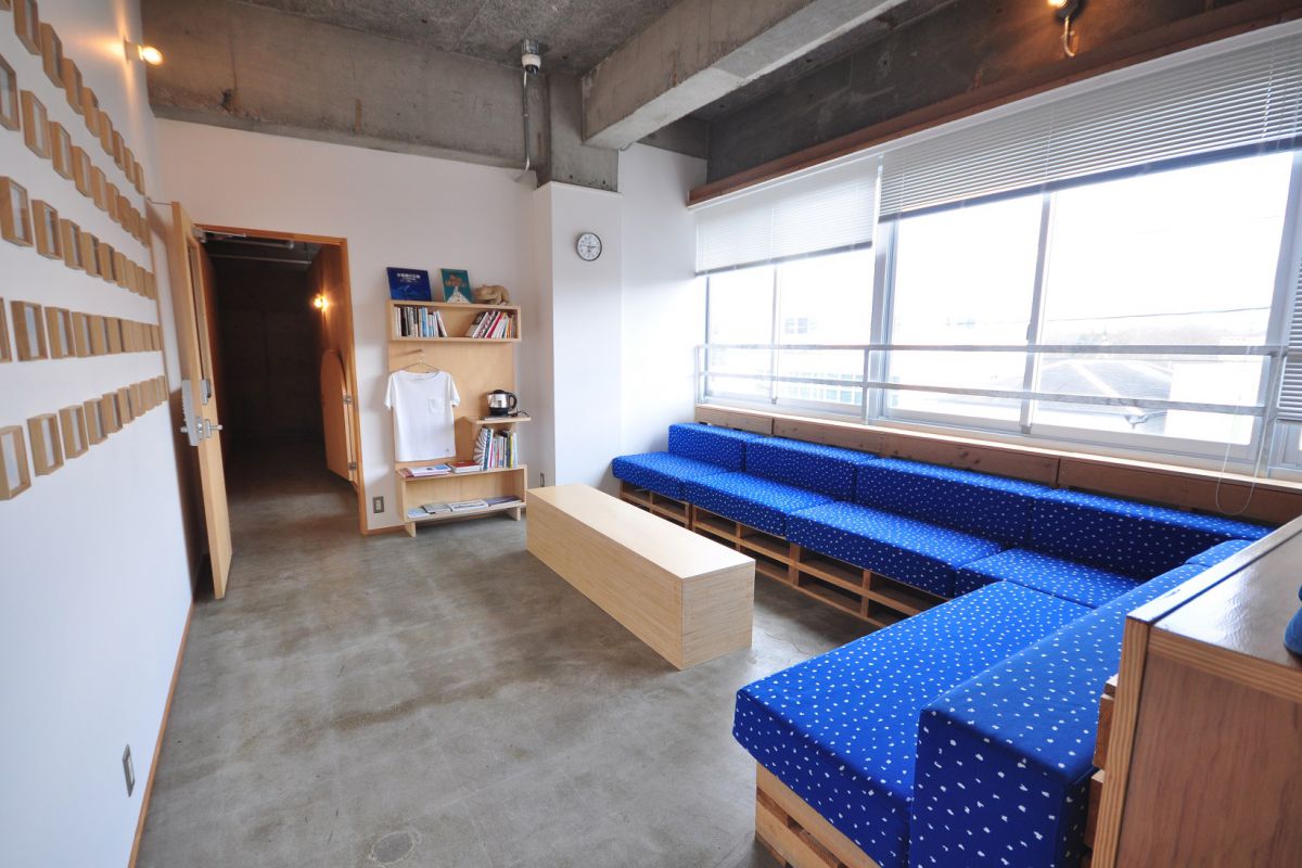 阿久根の海をデザインしたソファーが印象的なラウンジは、壁のテキスタイルも海をイメージしたもので、のんびり過ごせそう。