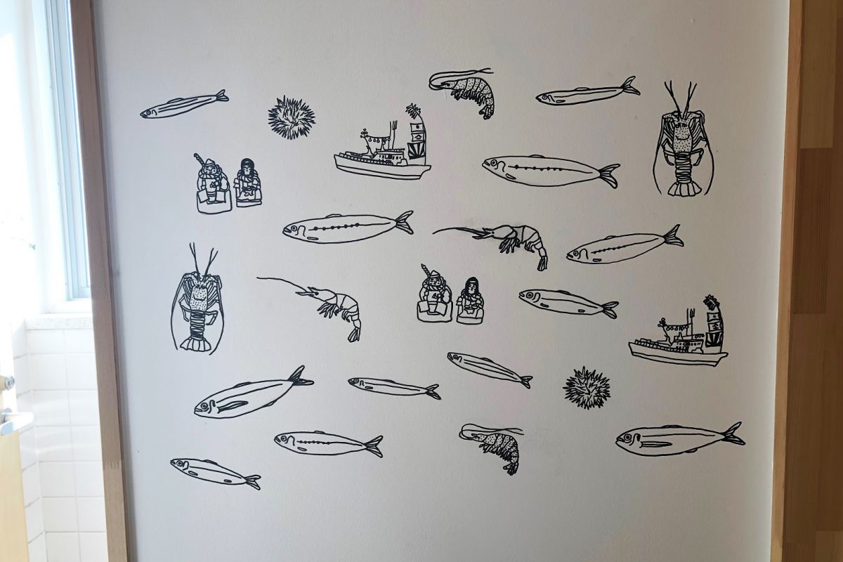 客室のトイレにはイワシやエビなどのイラストが描かれ遊び心も満点。イラストレーター手描きのイラストは、あちこちに「隠れイラスト」として潜んでいるので、宿泊した際にはぜひ探してみて下さい。