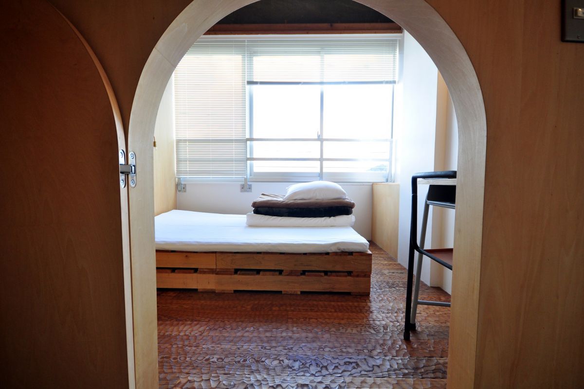 1泊4500円のダブルルーム(2名で宿泊の場合は5500円)。小さめの入り口から入る客室は、秘密基地のようなワクワク感を味わえます。