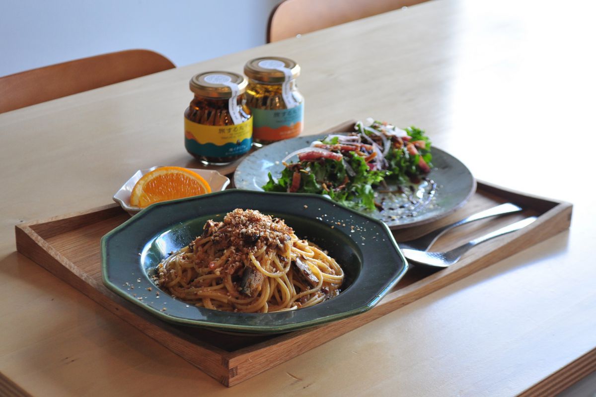 土・日曜限定でオープンするカフェでは、パスタランチ1000円などをいただけます。イチオシみやげの「イワシの丸干し」を使ったパスタもあるので、ぜひチェックしてみてください。