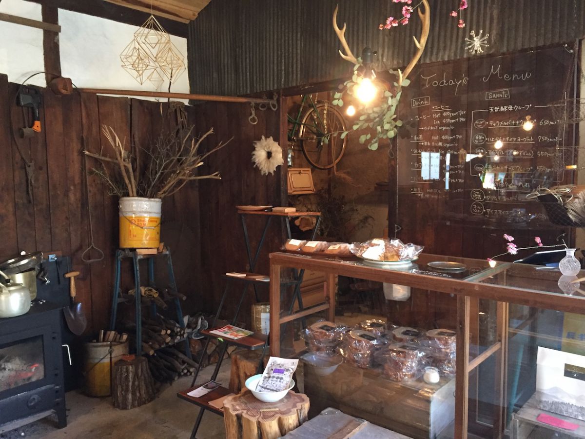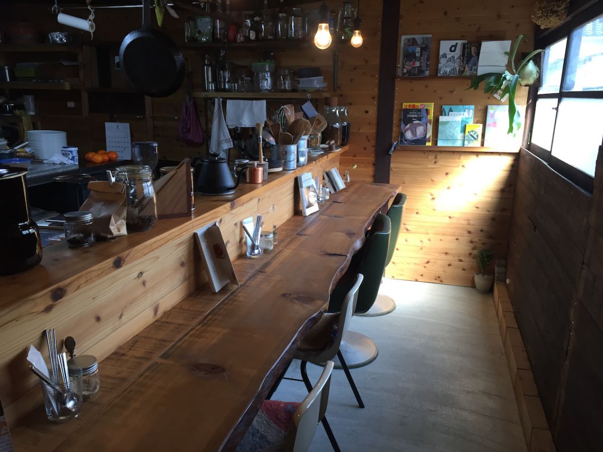 自宅の一角にある納屋をリノベーションしたという、木の温もりあふれるお店は、1階がショップ&キッチンとカウンター席、2階が靴を脱いで上がるカフェスペースになっています。