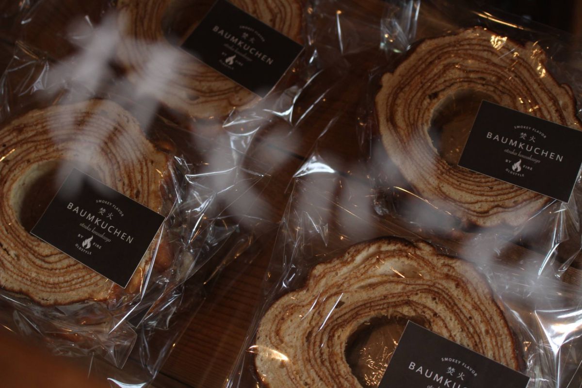 自分で手作りした窯で手焼きしている「焚火バームクーヘン」(1242円)は、なんと1日2本のみ。1本から14個のバームクーヘンができるので、1日28個作るのがやっと、とのこと。一定ではない焚き火の火力を肌で感じながら、8~9層のバウムクーヘンを手間ひまかけて焼き上げていきます。