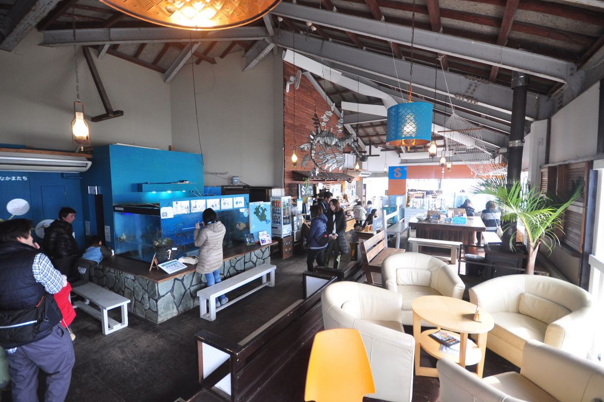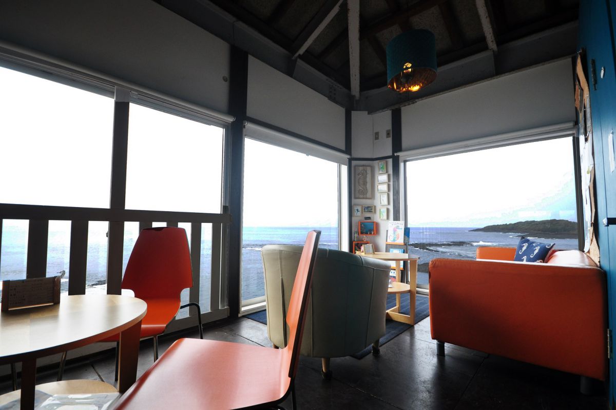 大きな窓から海を一望できるカフェスペースは最高のロケーション。これだけでもう幸運のシンボル・タツノオトシゴの恩恵を受けているかのような気になります。