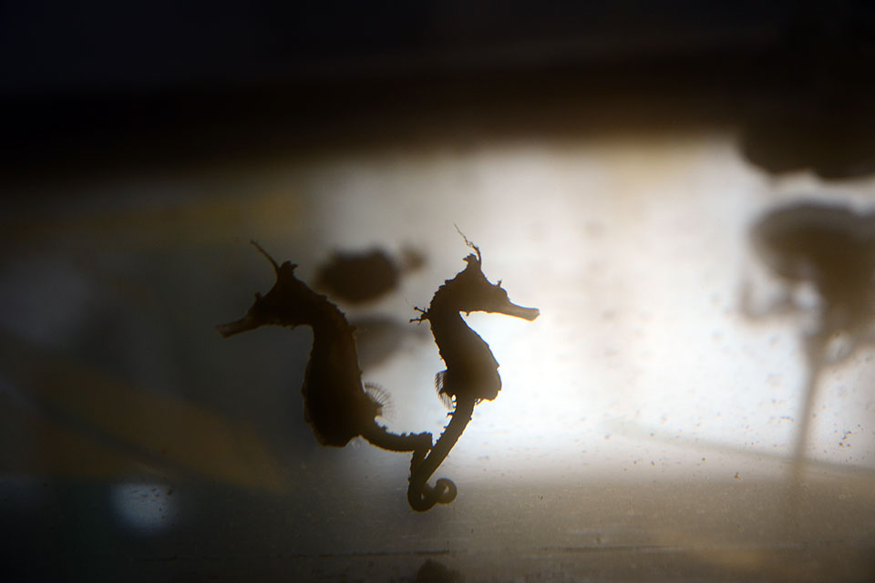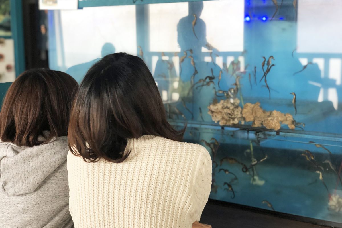 タツハウスでは、大小さまざまな水槽で、5種200匹ほどのタツノオトシゴを飼育。実はエラや背ビレ、胸ビレがある白身魚!というタツノオトシゴ。水槽の中を絡み合いながらゆらゆらと漂う様は、見ているだけで癒されます。