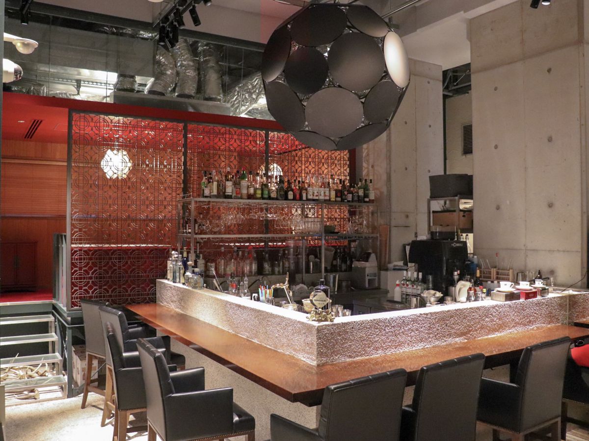店内奥に進むと、バーカウンターや仕切られた半個室の席も。カウンターの上から吊るされた大きなボールのような照明は「Black Ball」というタイトルのアート作品です。