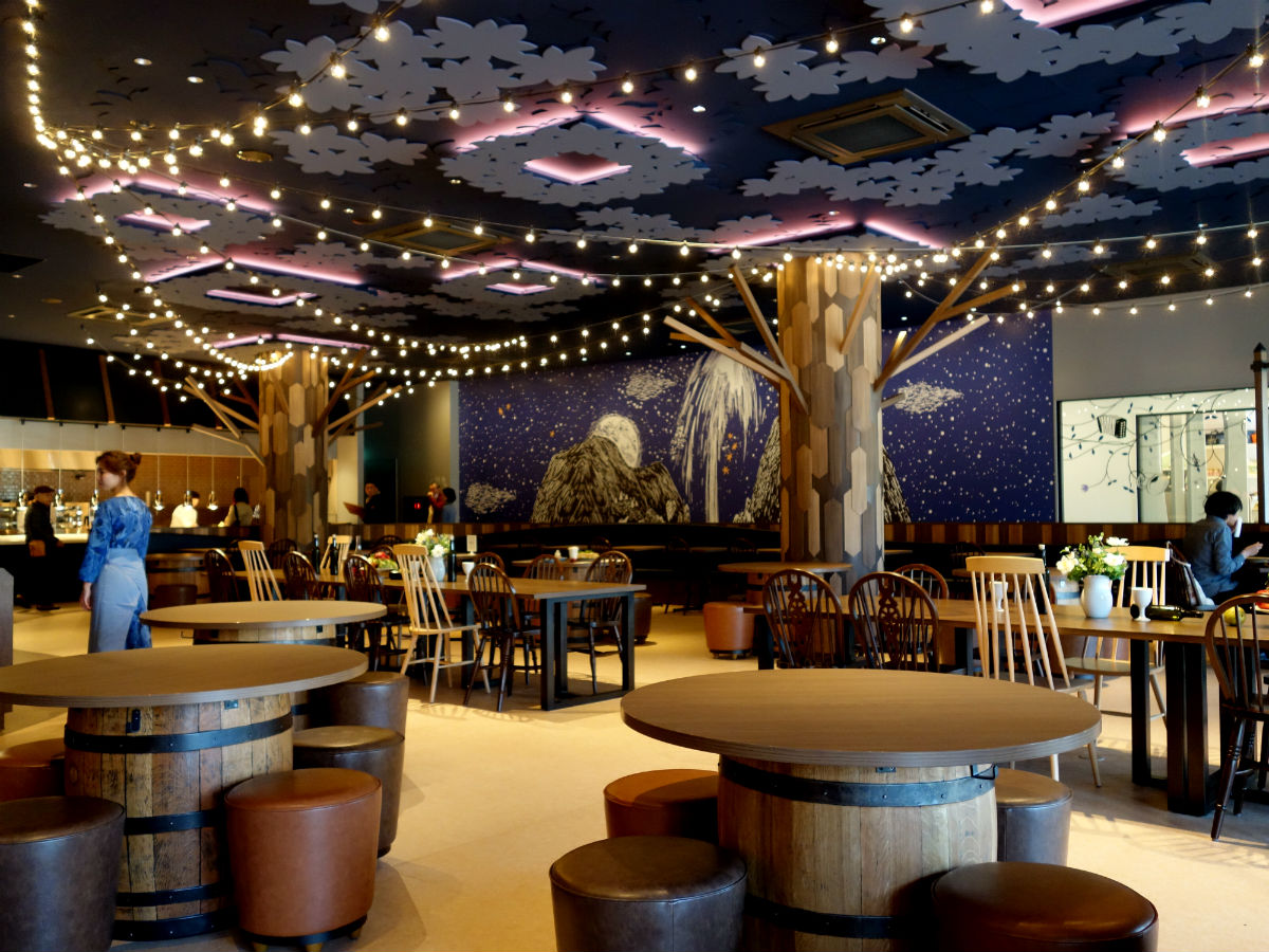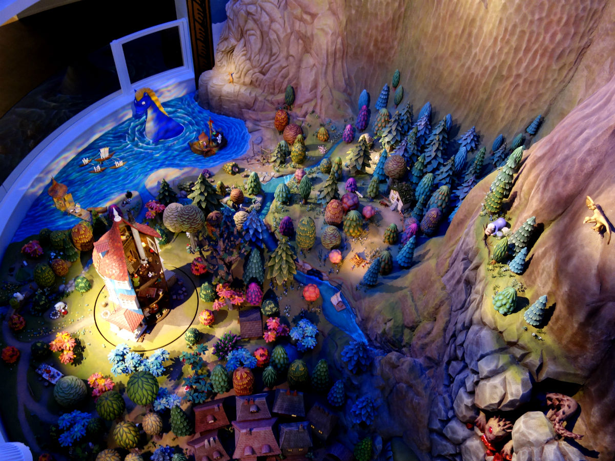 3階から2階の螺旋階段の中心には、8m超のムーミン谷の巨大ジオラマが。こちらは、15分に1回、全4パターンで照明が変わるそう。原作の「ムーミン谷の彗星」の照明もあるんだとか。ぜひ全パターン見てみたいですね!