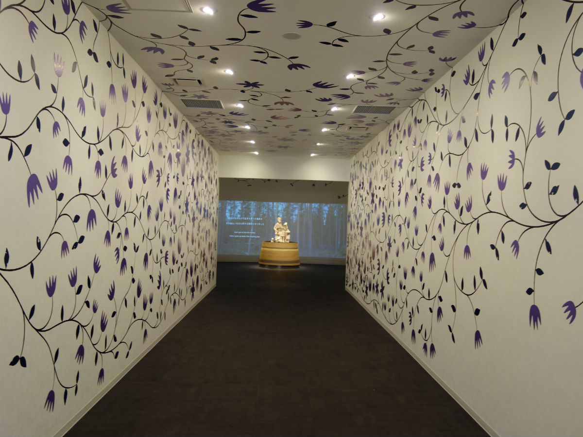 ギャラリーのはじまりは、真っ直ぐの通路から。こちらの壁に描かれたツルの葉には、ムーミンのキャラクターたちがこっそり隠れています。