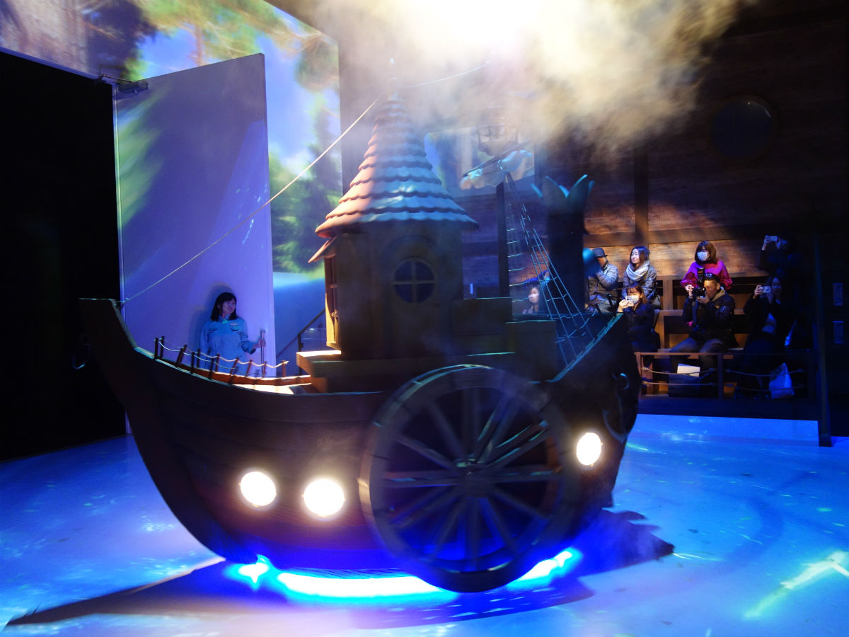 「海のオーケストラ号(メレンフイスケ)」は、若かりしムーミンパパと仲間たちの冒険を体験できる、体感モーフィングシアター。有料アトラクションですが、船が本当に動いているかのような美しい映像と仕掛けは、体験の価値あり!水濡れには注意!?