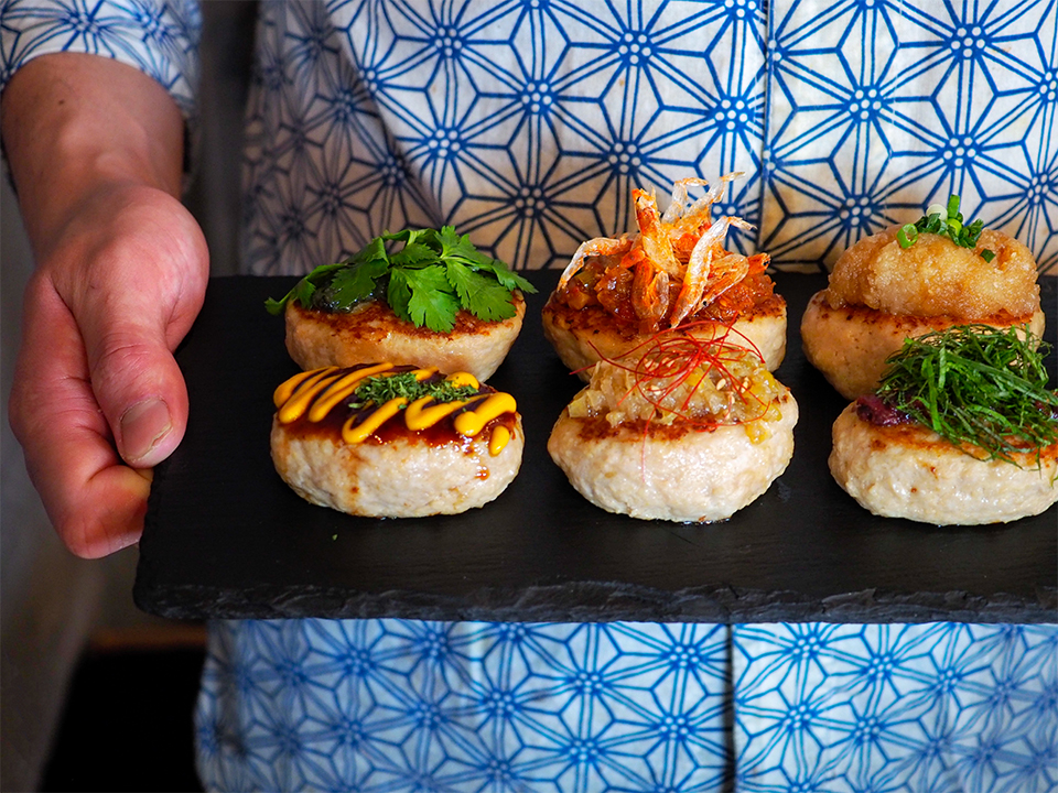 専用の鉄板で焼き上げたら、プレートの上で最終仕上げ。地鶏のおいしさをシンプルに伝える「塩つくね」と「たれつくね」(150円)に加え、ソースや薬味などをとりどりにのせた16種の「創作つくね」(180円〜)、野菜をつくねの生地で包んだ「野菜つくね」(250円〜)など、そのバリエーションは実に多彩です。