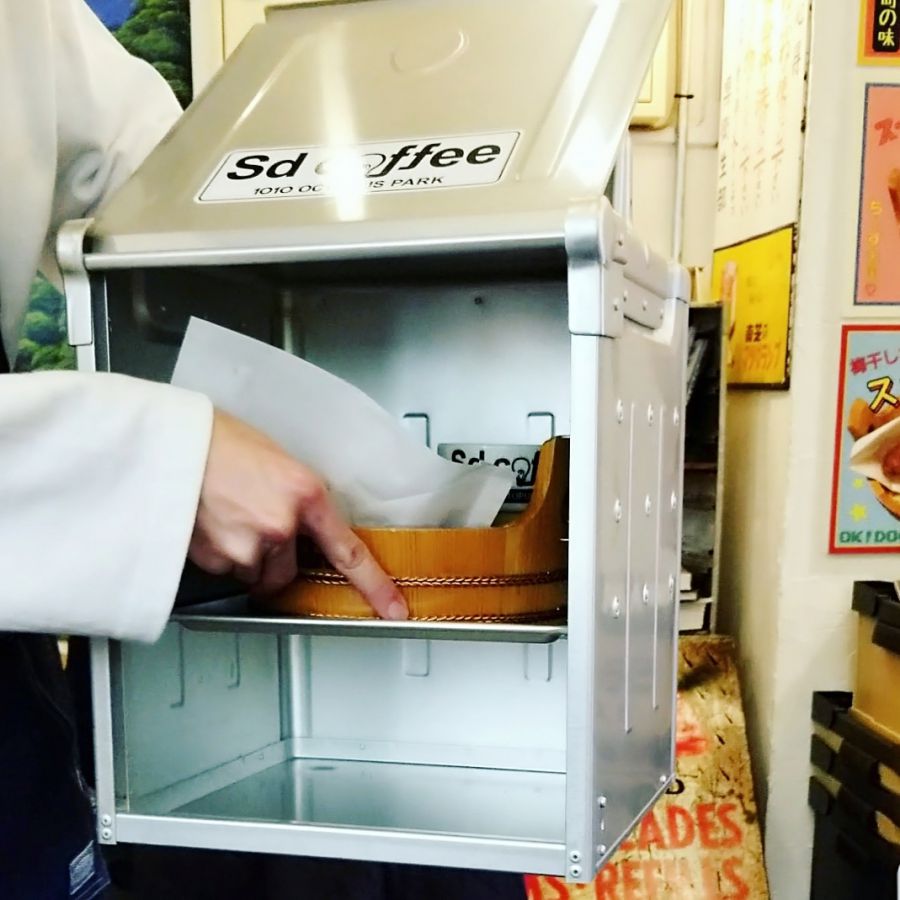 そんな銭湯気分の雰囲気を楽しみながら待っていると、黒猫オーダーができあがりました!なんと岡持ちで登場です!こんな楽しませてくれる演出は嬉しいですね。