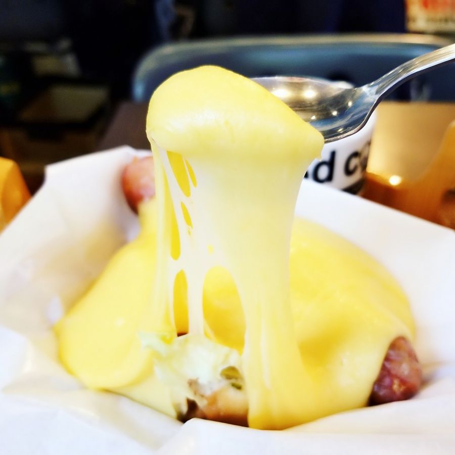 チェダーチーズとステッペンチーズを使っているので、たっぷりのめっちゃチーズは、よく伸びます。