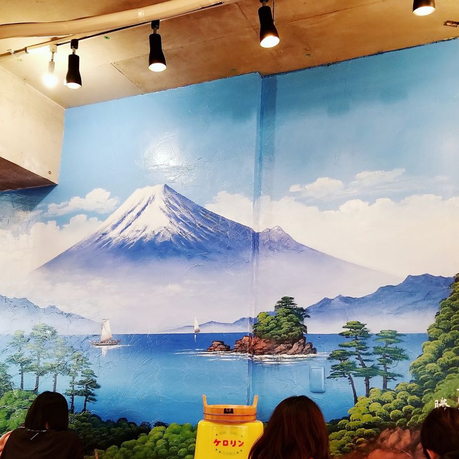 さらに賑わう店内に入ると、銭湯のペンキ絵を模した壁画に圧倒されます。