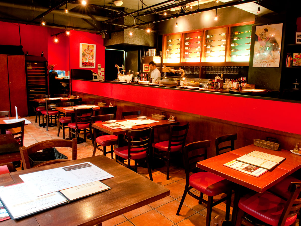JR渋谷駅から徒歩9分、レンガ造りの階段を降りた半地下にある「渋谷スペインビストロ料理 ラス ボカス」は、ヨーロッパの街角にあるような異国情緒あふれるバル。店内は赤と黒を基調とした空間で、スタイリッシュでシックな大人の飲み会を実現させてくれます。