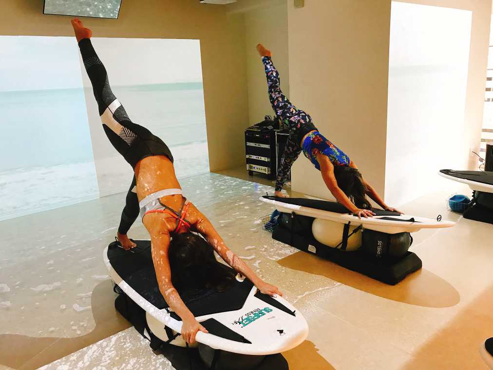 こちらで体験できるのは、バランスボールが内蔵されたサーフボードに乗ってトレーニングを行うロサンゼルス発の最新エクササイズ。